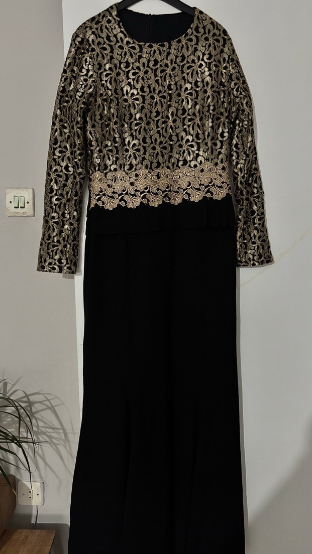 Uzun kollu ve yakalı, vücuda oturan siyah abiye elbise, üst kısmı dantel desenli ve vintage şıklık sunar, düğünler için uygundur.