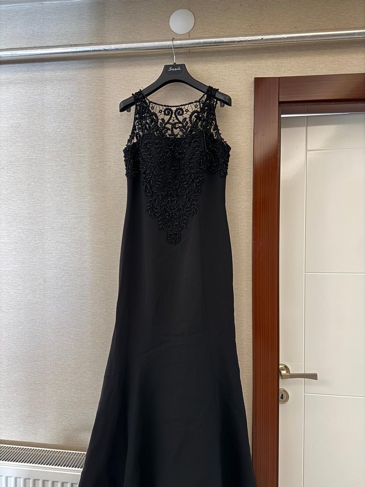 Dantel Detaylı Siyah Uzun Abiye Elbise