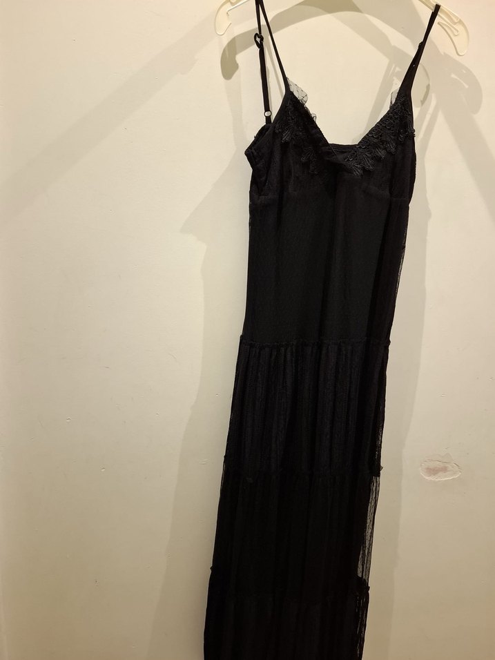 Dantel Detaylı Siyah Uzun Askılı Elbise