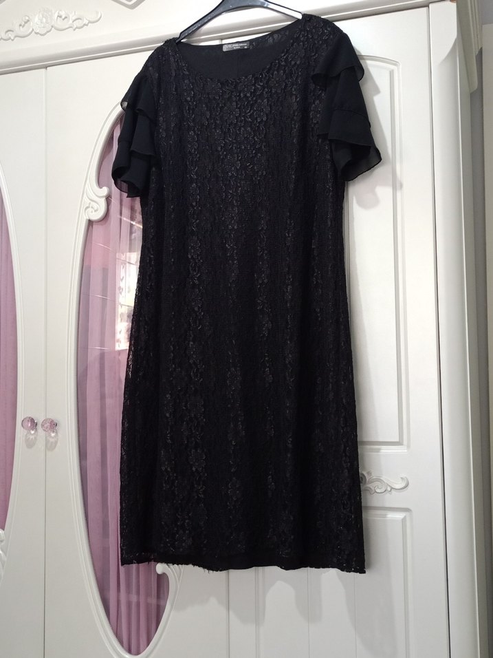 Siyah dantel kumaşlı, kısa kollu ve bol kesim uzun elbise. Kayık yaka ve gotik stile sahip, ofis için uygun.