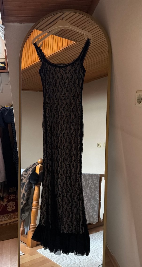 Dantel detaylı, yılan desenli siyah uzun elbise, tekne yaka ve askılı kollu, romantik akşamlar için uygundur.