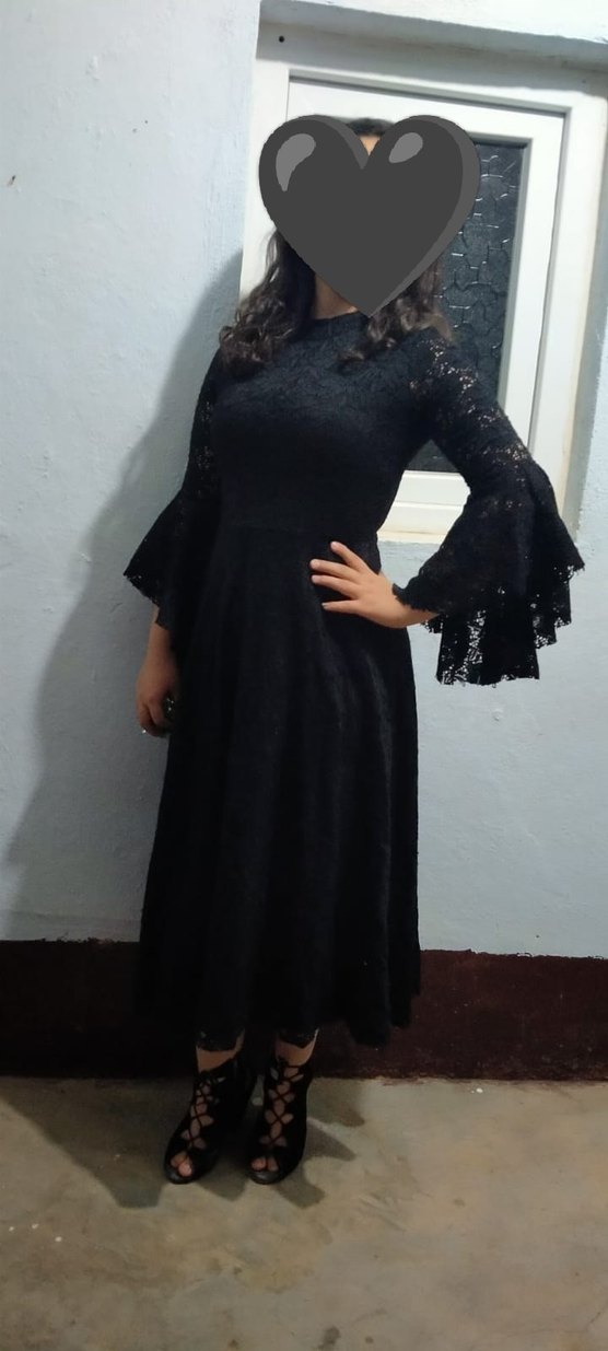 Dantel detaylı, uzun kollu, hakim yaka ve oturan kesimli siyah uzun elbise, klasik gotik şıklığı yansıtıyor. Düğünler için uygun.