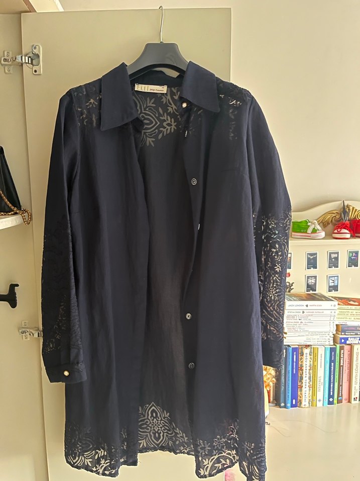 Dantel detaylı, siyah uzun hamile ceketi. Keten kumaştan, bol kesim ve uzun kolludur. Ofis kullanımı için uygundur.