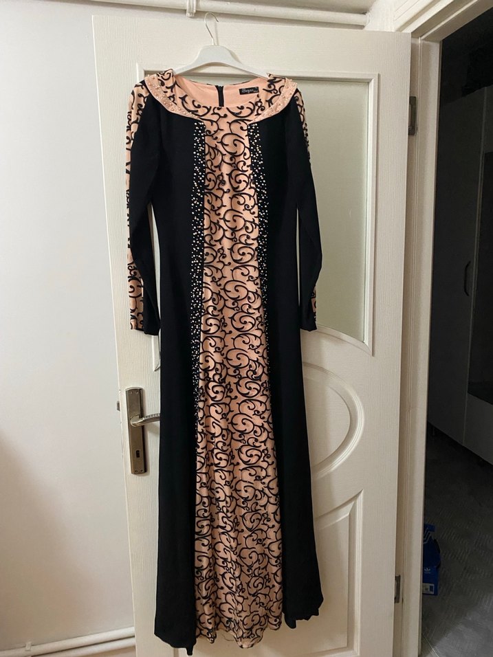 Dantel detaylı, uzun kollu ve tekne yaka, siyah desenli, vücuda oturan uzun abiye elbise. Düğün için uygundur.