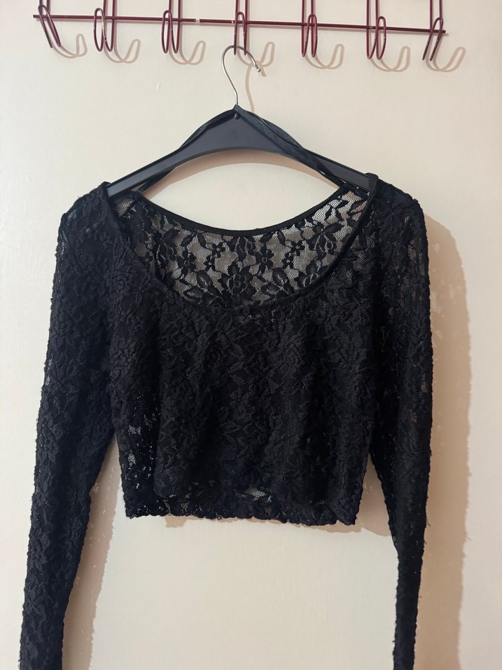 Siyah uzun kollu, dantel dokulu ve tekne yaka olan bu bluz, fitted kesimiyle romantik buluşmalar için uygundur.