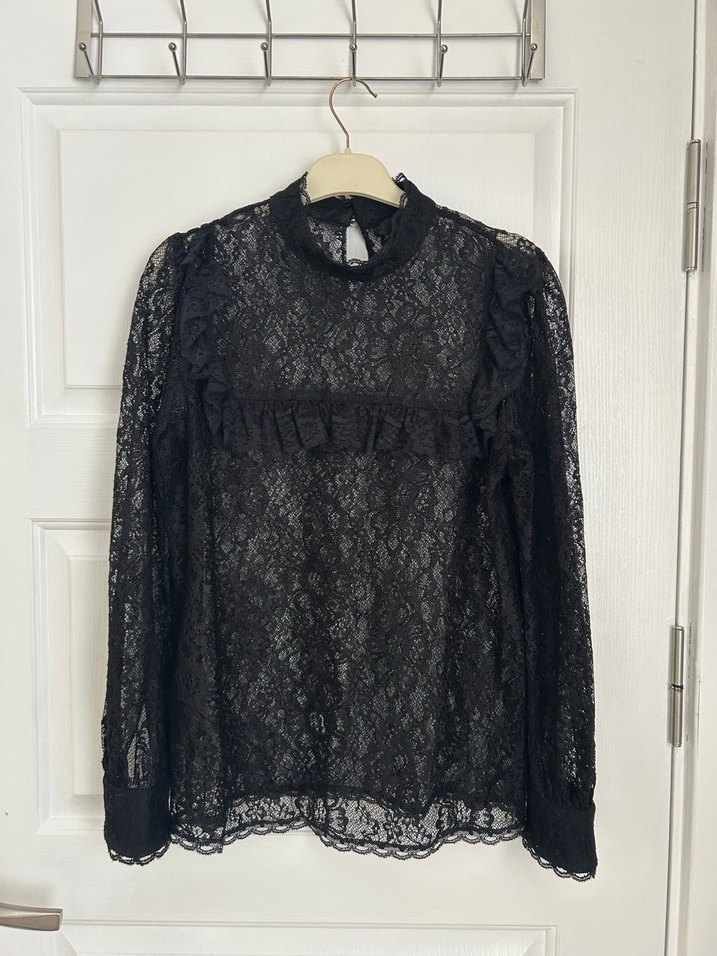 Uzun kollu, yüksek yakalı siyah dantel bluz, nakış detaylı , ofis kullanımı için uygundur. Koltuk altı genişliği 49 cm yüksekliği 64 cm düz model etek ucu 49 cm. Beyaz etiket içten gözüküyor diye sökmüştüm 38 bedenken kullandım ölçüleri lütfen kontrol ediniz