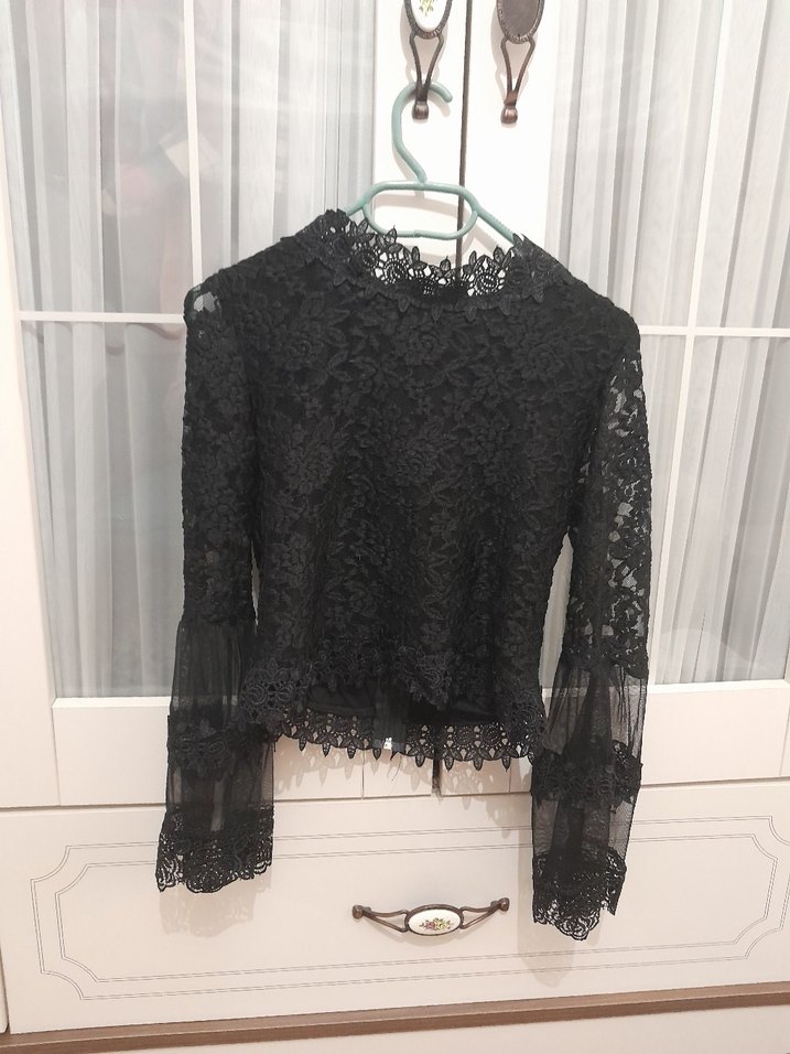 Dantel işlemeli uzun kollu, yüksek yakalı siyah bluz, gövdeye oturan kesimi ve gotik tarzıyla ofis için uygundur.tum özel günlerinizde çok şık bir parça s beden