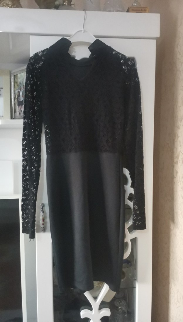 Dantel detaylı uzun kollu ve yüksek yakalı, siyah gotik tarzda, ofise uygun dar kesim elbise.