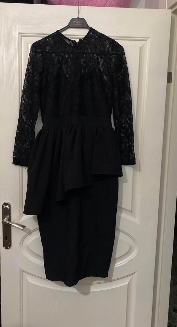 Dantel uzun kollu, yakalı ve desenli klasik şıklıkta, vücuda oturan siyah gece elbisesi. Eni 40 cm boyu 113 cm