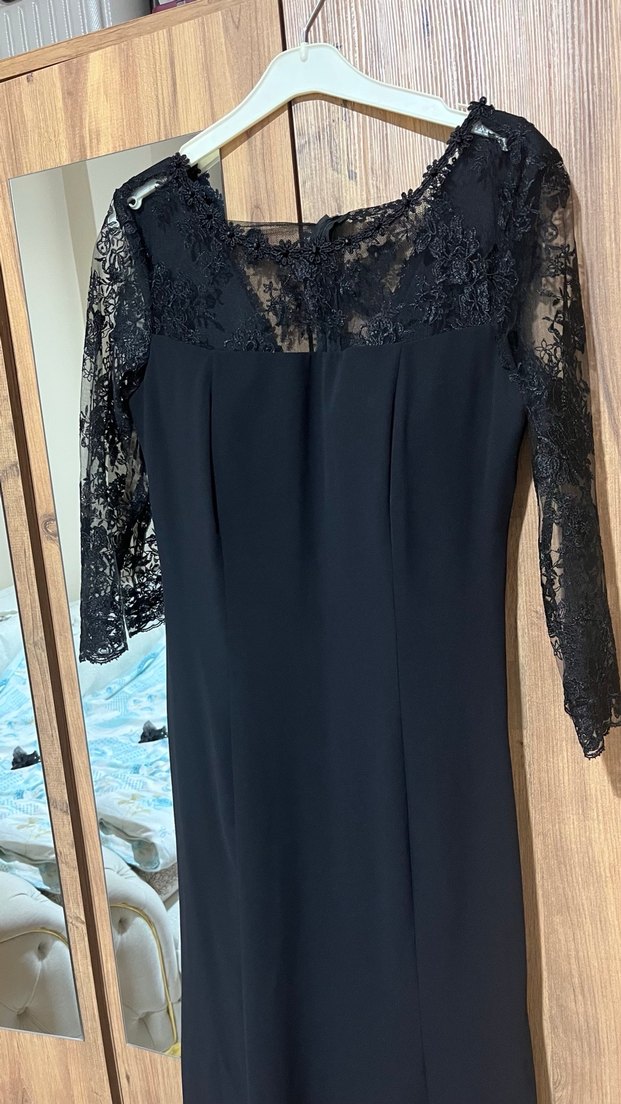 Dantel Detaylı Siyah Uzun Kollu Kadın Abiye Elbise