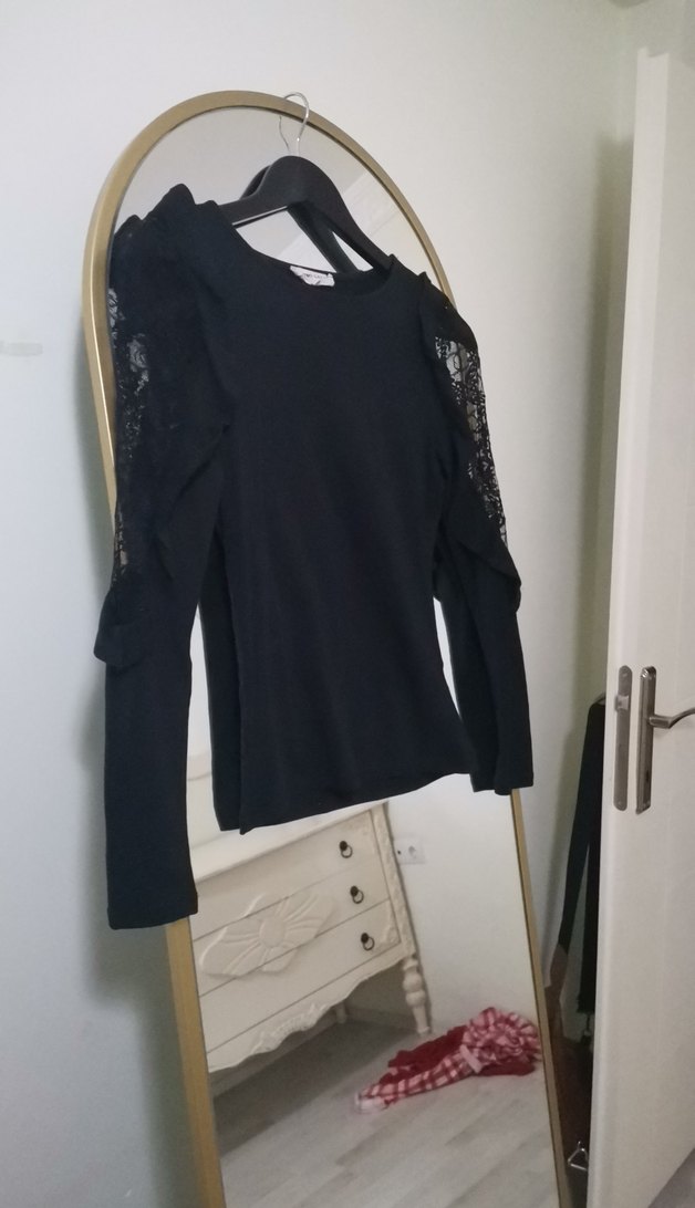 Dar kesim siyah triko bluz, uzun kollu ve dantel detaylıdır. Yuvarlak yaka ve gotik tarzda günlük kullanım için uygundur. Bedeni m ancak 34-36 olur