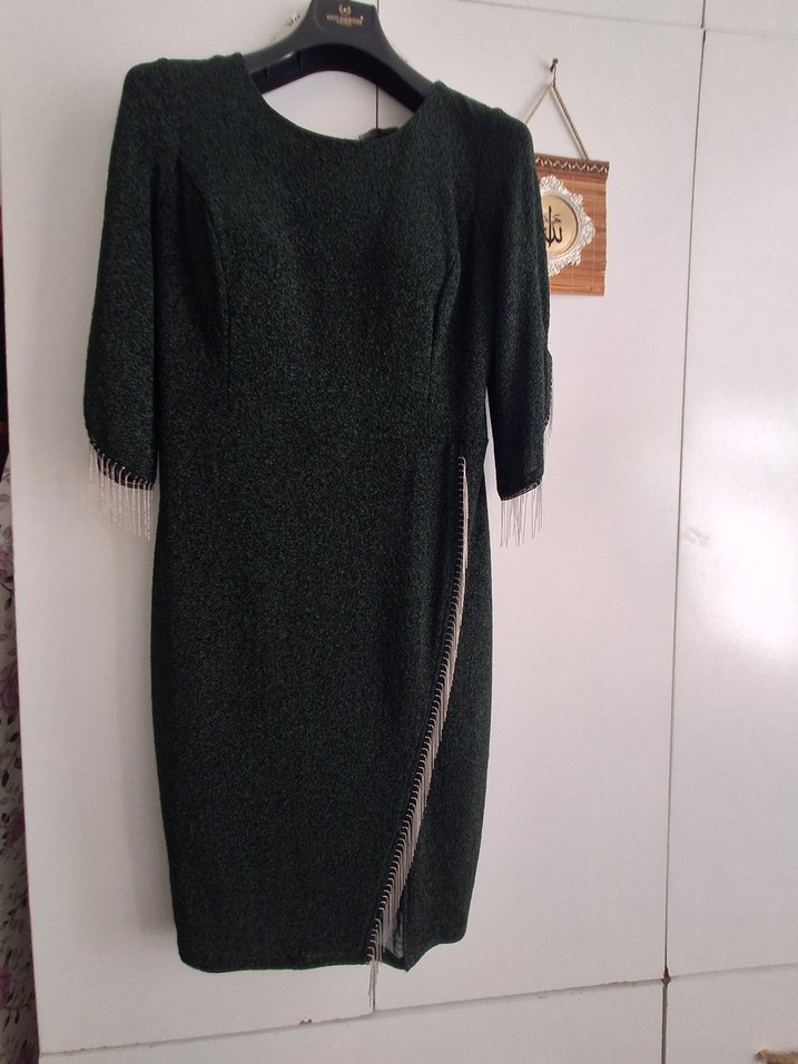 Dar kesim siyah kadın elbise, uzun kollu ve yuvarlak yakalıdır. Nakış detayları ve kenarda fermuar bulunur. Ofis için uygun, gotik tarzda bir modeldir.