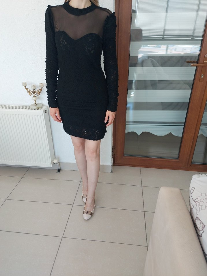 Yumuşak örgü kumaştan, dantel detaylı, yüksek yakalı ve uzun kollu siyah mini elbise. Cesur gotik tarz için uygundur, romantik akşamlar için ideal. 36-42 uyumlu.