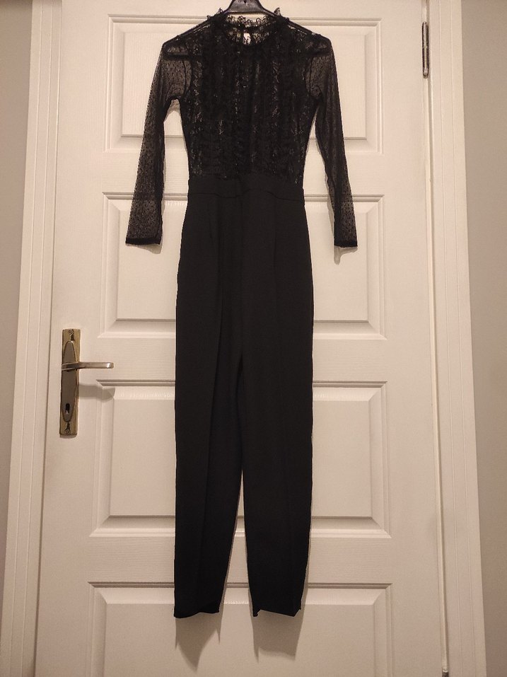 Dantel detaylı, uzun kollu ve yüksek yakalı siyah tulum. Pürüzsüz sentetik kumaştan, klasik ve şık bir görünüm sunar.