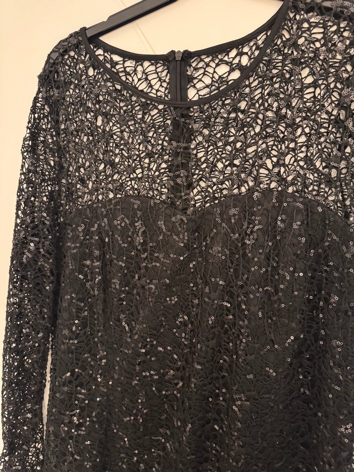 Dantel detaylı, uzun kollu, tekne yaka ve desenli siyah uzun abiye elbise. Romantik akşamlar için uygun, vücuda oturan kesim.