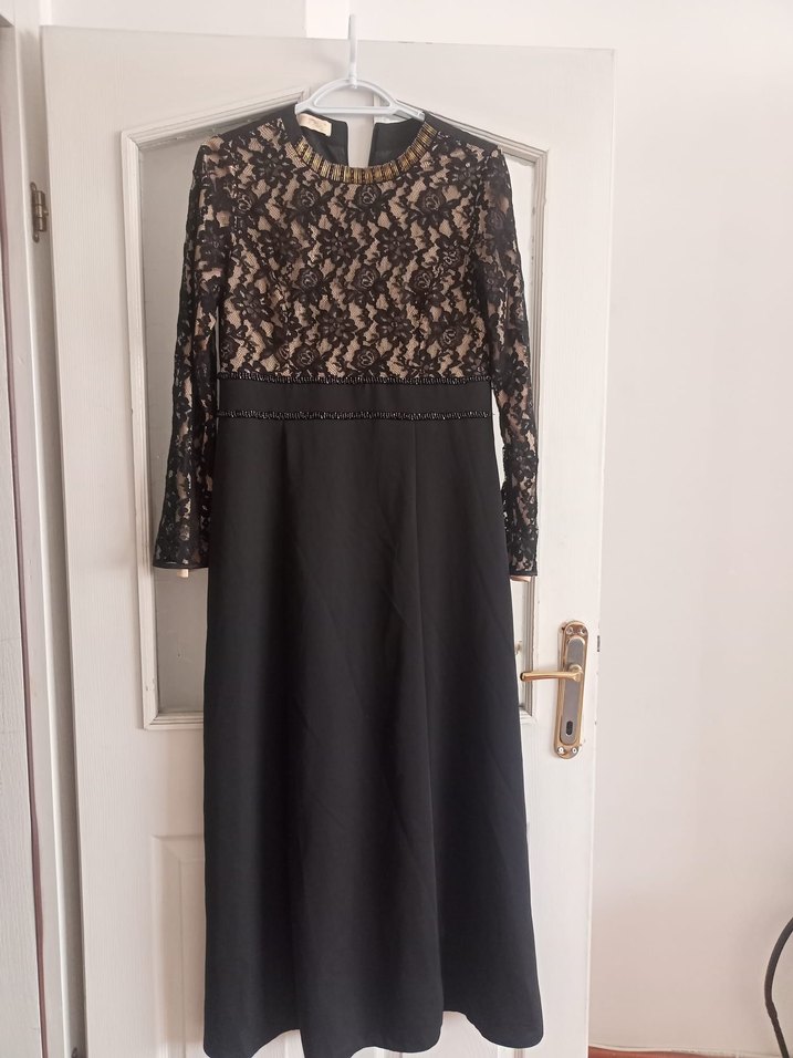 Dantel detaylı üst kısmı ve uzun kollu siyah uzun elbise, yuvarlak yaka ve regular kesim, romantik akşamlar için uygundur. Gotik tarzda, desensiz ve sentetik kumaştan yapılmıştır.