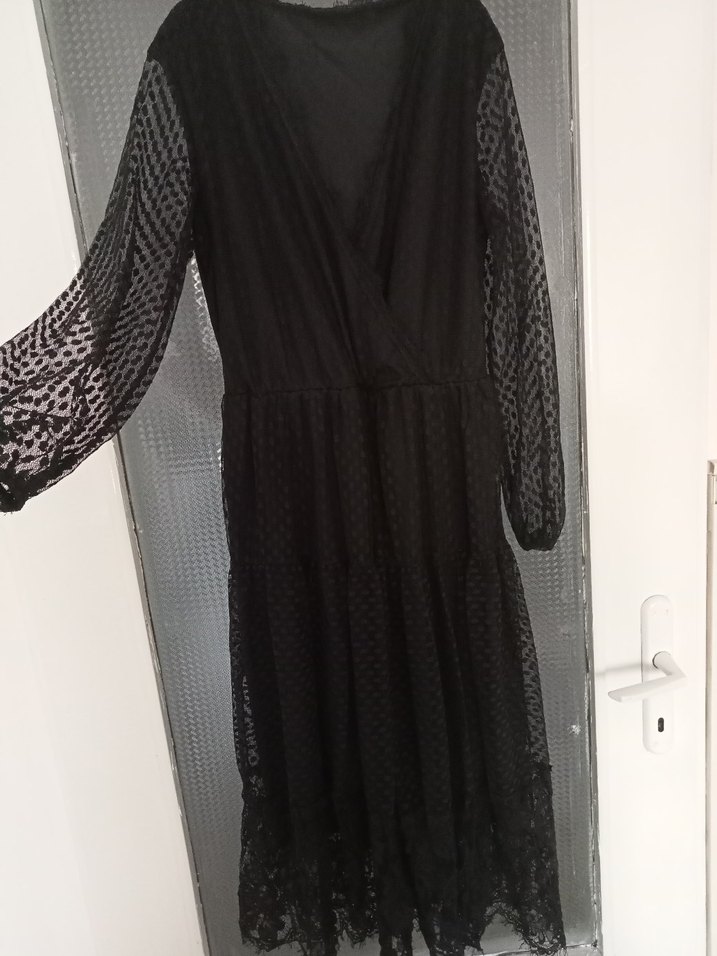 Dantel detaylı, uzun kollu ve V yakalı siyah uzun elbise. Rahat kesimi ve yumuşak sentetik kumaşı ile günlük kullanıma uygundur.