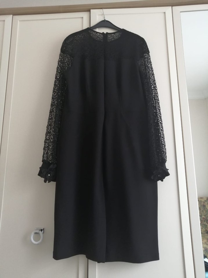 Siyah uzun elbise, uzun dantel kollara ve bisiklet yaka sahiptir. Yumuşak sentetik kumaştan yapılmış, bol kesimdir. Gotik tarz ve klasik zarafet sunar, ofis için uygundur.