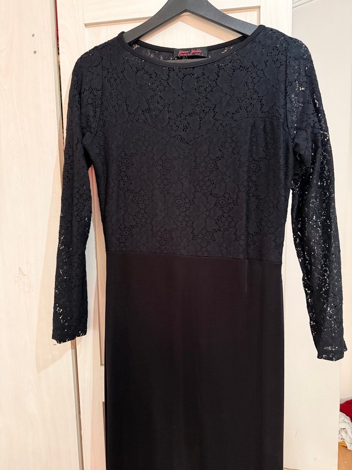Dantel uzun kollu, siyah uzun elbise, vücuda oturan kesime sahip. Yuvarlak yaka ve gotik tarzıyla romantik akşamlar için uygun.