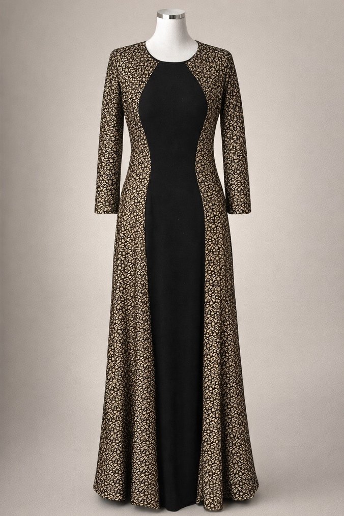 Dantel detaylı, yüksek yakalı siyah uzun elbise. Uzun kollu ve desenli sentetik kumaştan, ofis için uygun düzenli kesim.