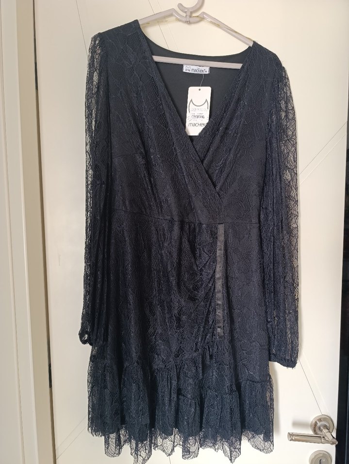 Siyah renkte, uzun kollu dantel detaylı, V yakalı ve bol kesim gece elbisesi. Gotik tarzda, baskılı desenli ve bohem havası taşıyor.