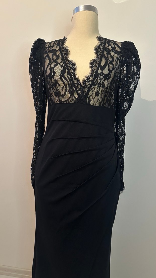 Dantel detaylı, uzun kollu ve V yakalı siyah elbise, klasik gotik şıklığı romantik akşamlara taşır.
