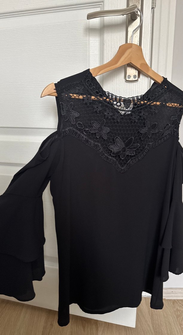 Siyah uzun kollu, V yakalı bluz dantel ve işlemeli çiçek desenleriyle bohem ve gotik tarzı yansıtır. Rahat ve bol kesimdir, romantik akşamlar için uygundur.