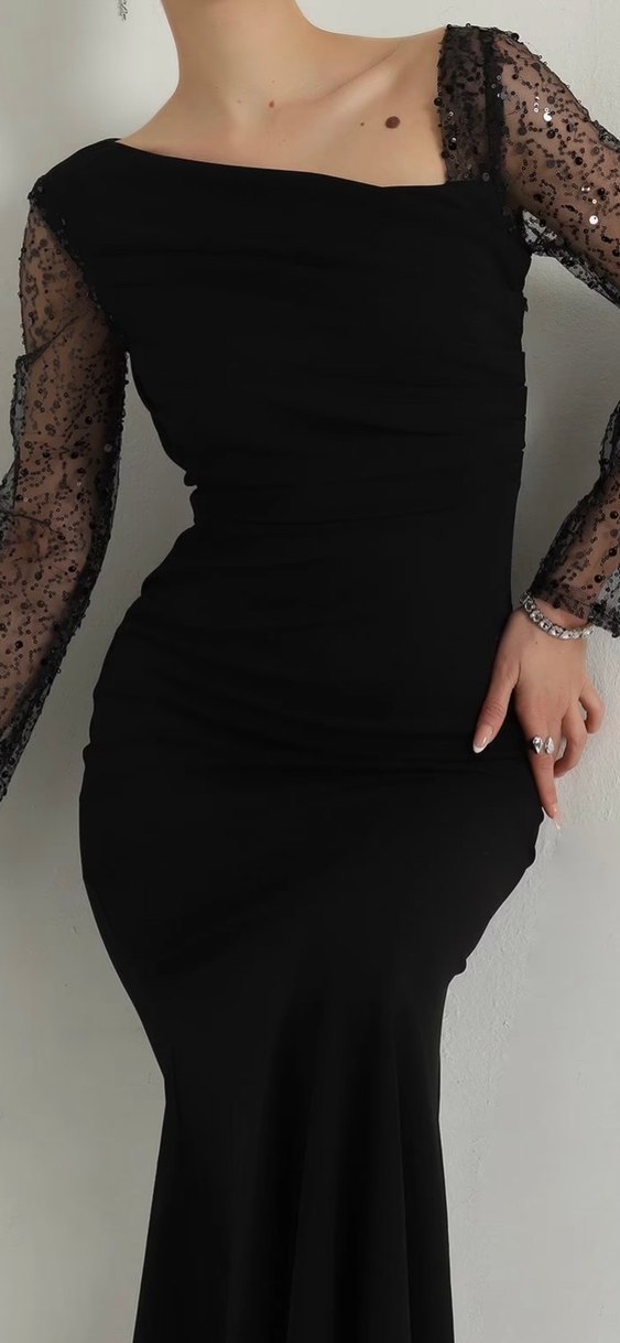 Dantel detaylı, ince işlemeli tül kolu ve V yaka tasarımıyla siyah, dar kesim uzun elbise. Cesur, gotik tarzda romantik akşamlar için uygun.