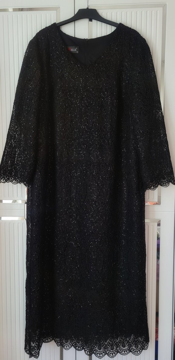 Bu uzun siyah gece elbisesi dantel kumaş ve nakışlı desenlere sahiptir. V yaka, uzun kollu ve klasik şıklık için düzenli kesimdir. Bir kere kullanılmıştır. Tesettüre de uygundur.