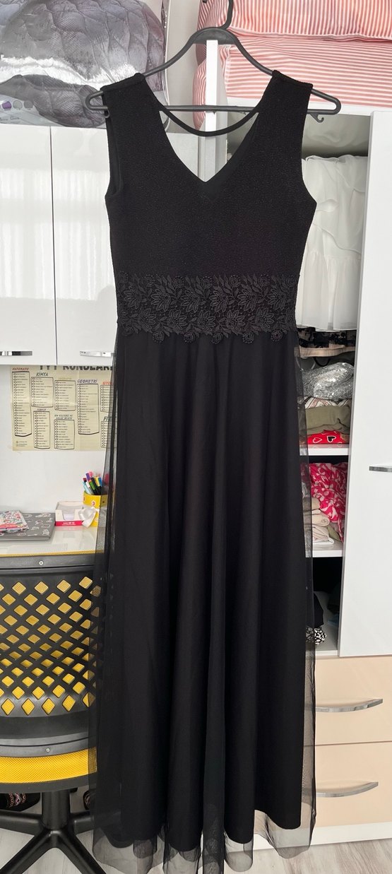 Siyah, uzun ve v yaka olan bu elbise, dantel detaylı bel kısmı ve kolsuz, vücuda oturan kesimiyle dikkat çekiyor. Yumuşak sentetik kumaştan üretilmiştir.