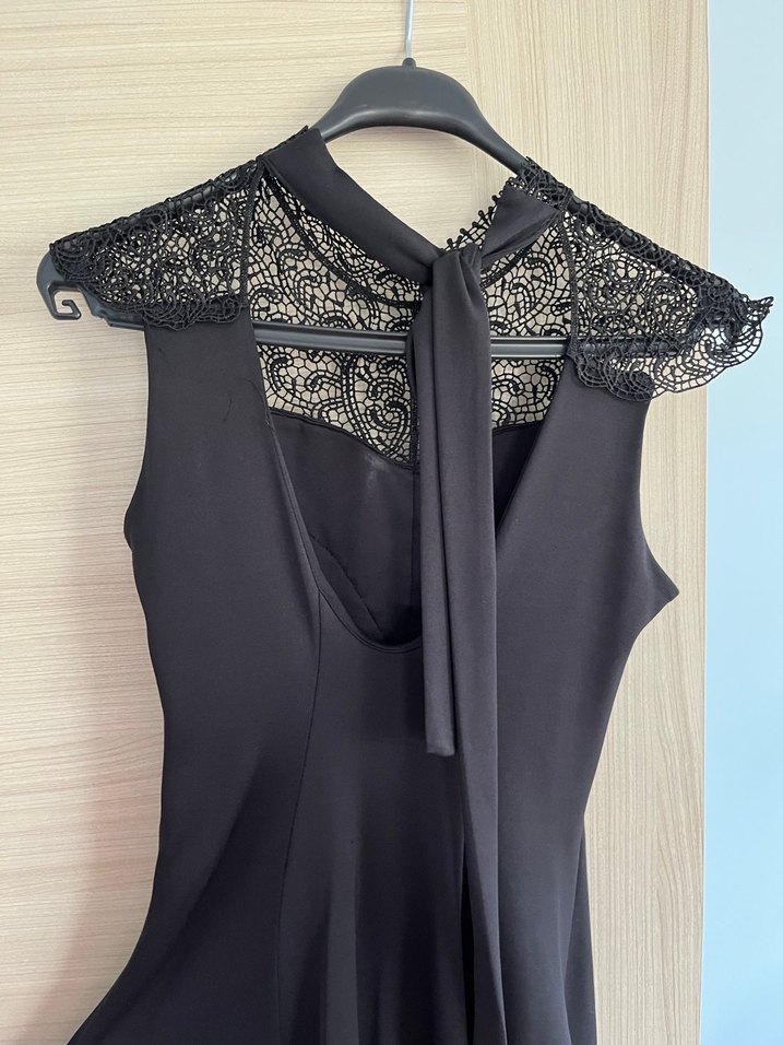 V yakalı, dantelli omuz ve sırt detaylı, siyah uzun ve dar kesim gece elbisesi. Kolsuz, m beden esnek yapıdadır