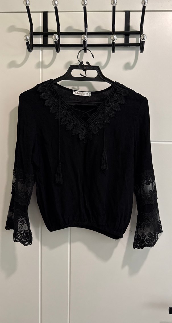 Fullamoda M beden Siyah bluz, uzun kollu ve dantel detaylıdır. Yakası V yaka ve nakışlı desenlerle ve ip detayı mevcuttur. Alt kısmı lastiklidir. günlük kullanım için uygundur. Dilerseniz şık olarak da kombin yapabilirsiniz kollarındaki dantel detayları çok şık zarif duruyor hiçbir deformesi yoktur. S ve M bedene uyumludur.
