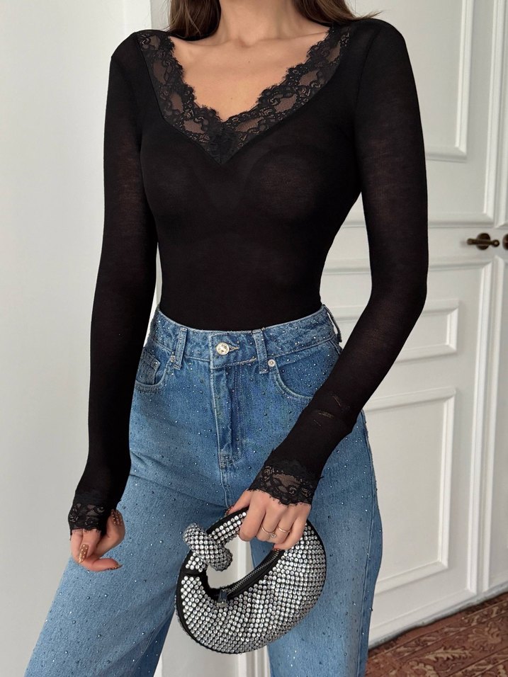 Dantel detaylı V yaka ve uzun kollu, siyah, vücuda oturan bluz. Ürün sıfır ve etiketlidir S m l beden mevcuttur Lütfen istediğiniz beden için ilan açtırınız Zara marka değildir
