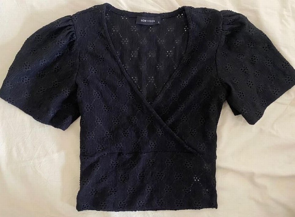 Dantel işlemeli, kısa kollu, V yaka ve fitted kesim siyah bluz, yumuşak sentetik kumaştan yapılmıştır.