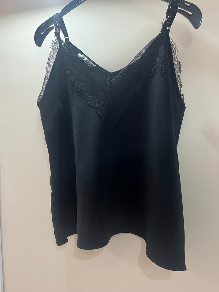 Siyah kadın atlet, V yaka ve dantelli detaylara sahip. Gevşek kesim ve normal boyda, sentetik kumaştan üretilmiştir. Trendy günlük gotik stil için uygundur.