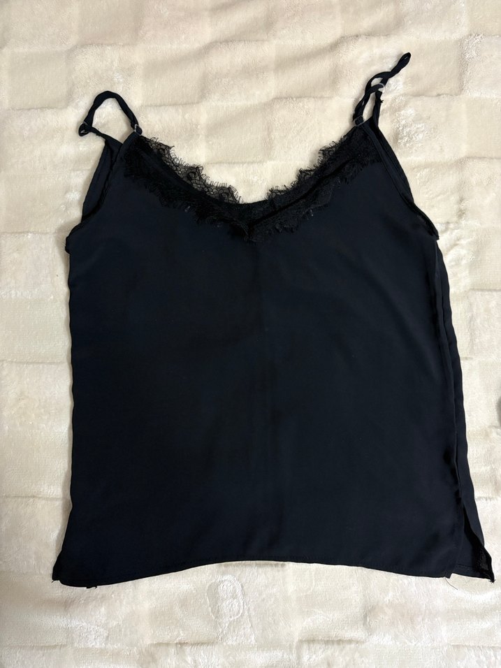 Siyah, dantel detaylı V yaka, kolsuz kadın atlet. Rahat kesimli ve ipeksi dokulu, günlük kullanım için uygundur.