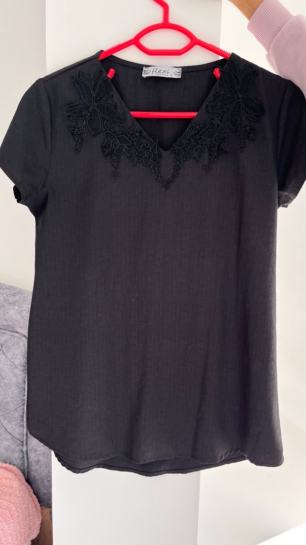 Dantel işlemeli V yaka ve kısa kollu siyah kadın bluz, rahat kesim ve normal boy ile günlük kullanıma uygundur.