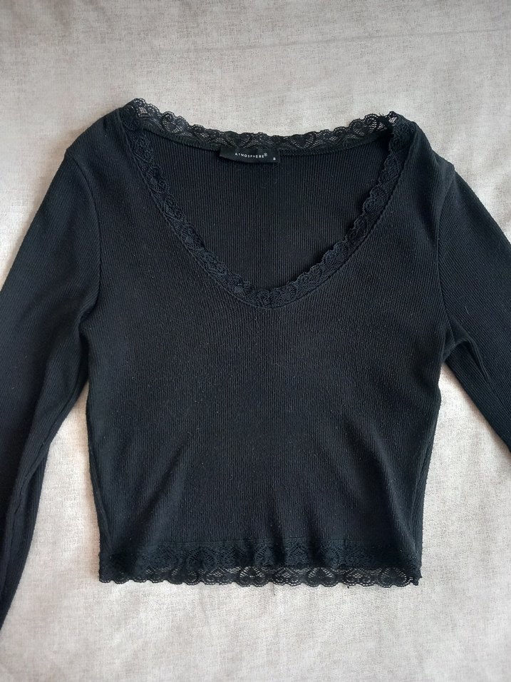 V yaka ve dantel detaylı, uzun kollu, siyah, dar kesim kadın kazak. Günlük kullanım için uygundur, gotik tarzda.