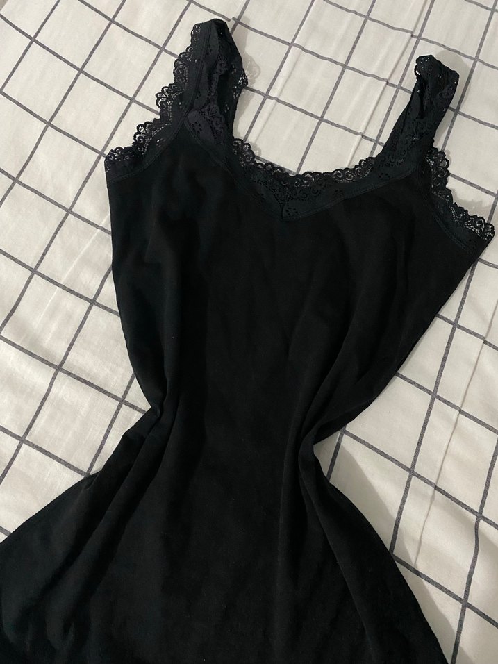 Dantel detaylı, V yaka ve kolsuz, siyah renkli kadın atlet. İnce ve ipeksi kumaş, normal midi boy, gotik tarzda, günlük kullanıma uygun. sona fotograf koydum üstümde durusu iciin ürün yepyenii teklıflere acigimm