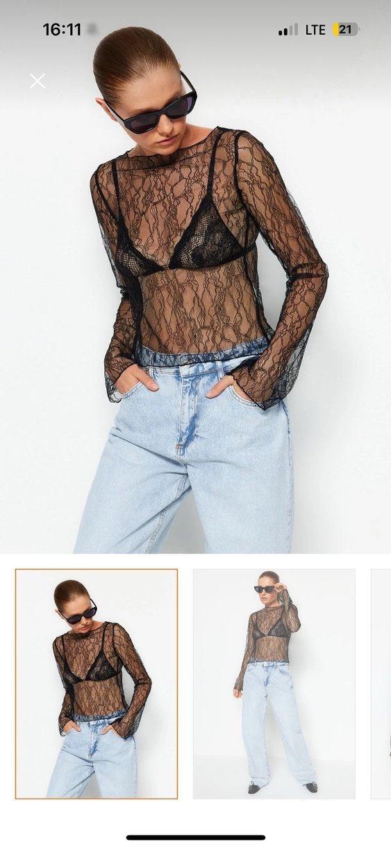 Siyah, dantel kumaştan, uzun kollu ve V yaka olan, rahat kesim bir günlük bluz. Hiç giyilmedi