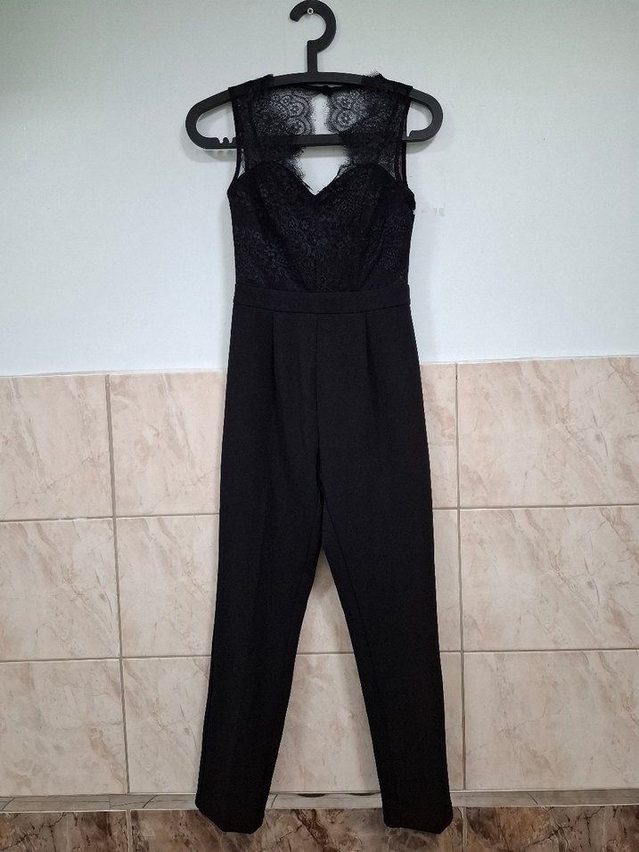 Dantel detaylı, V yaka ve kolsuz üst kısmı olan, siyah renkli, vücuda oturan tulum. Midi boyda ve sentetik kumaştan üretilmiştir, parti için uygundur. sıfır üründür xs bedene uyumludur