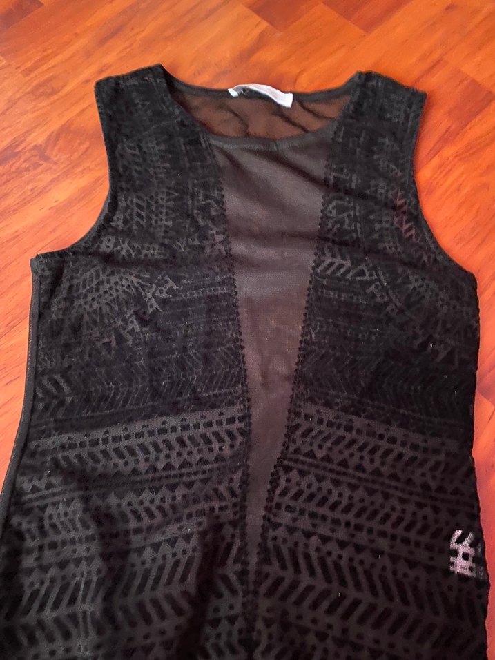 Kolsuz, v yaka, uzun kesim siyah kadın body. Yumuşak sentetik kumaştan, desenli. Az kullanıldı.