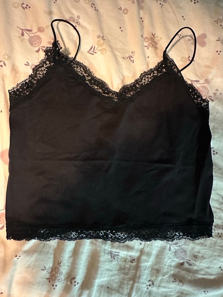 Siyah, dantel detaylı, V yakalı ve ince askılı, ipeksi dokulu, normal uzunlukta, gotik tarzda dar kesim kadın atlet.