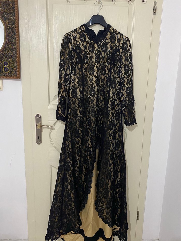 Dantel detaylı, yılan desenli siyah uzun elbise, uzun kollu ve yüksek yakalı, klasik ve gotik tarzda, bol kesimle tasarlanmıştır. Hiç giyilmedi