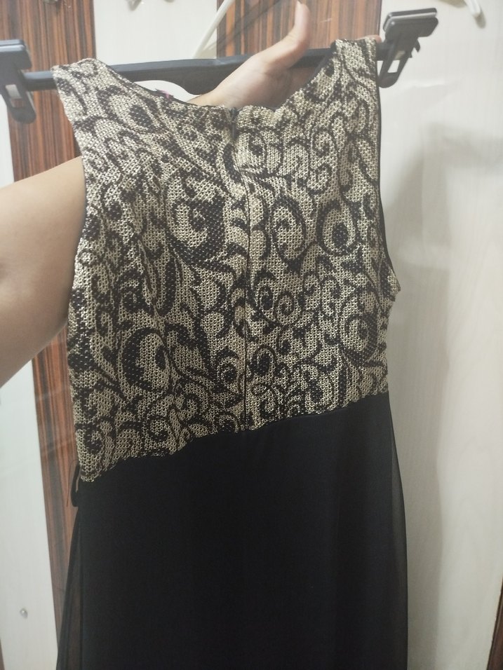 Kolsuz, V yakalı, dantel ve yılan desenli detaylara sahip siyah uzun elbise. Vintage ve bohem tarzıyla ofis kullanımı için uygun.