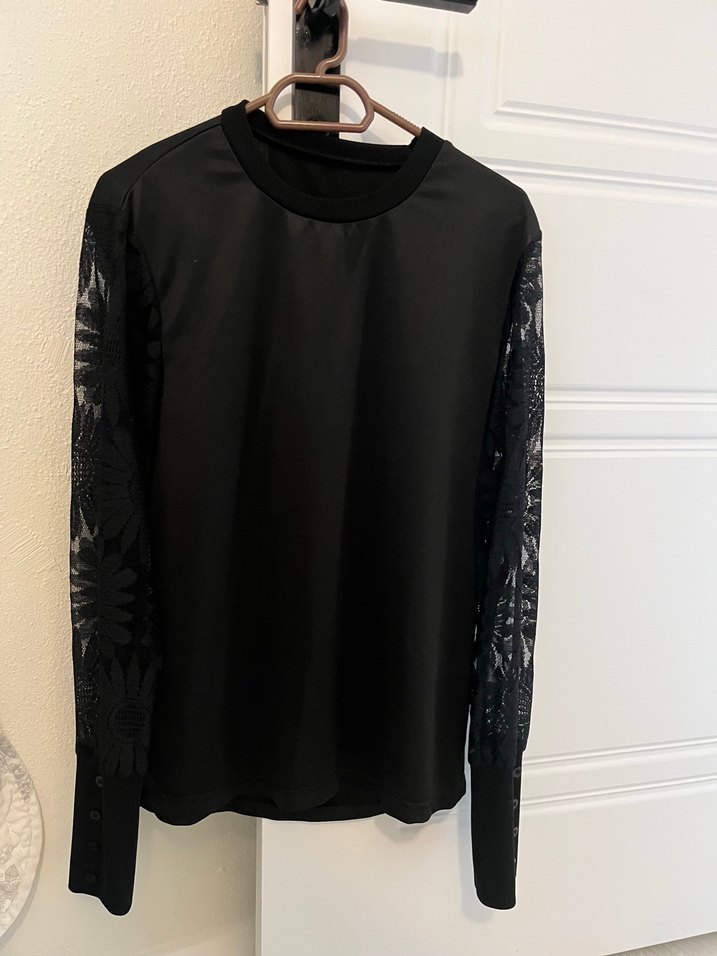 Siyah, dantel uzun kollu ve yüksek yakalı, sentetik kumaştan yapılmış normal kesim