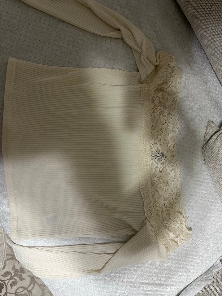 Dantel detaylı, straplez yakalı ve uzun kollu, ince bej renginde, bohem tarzda, vücuda oturan kadın bluzu. Yumuşak sentetik kumaştan, günlük kullanıma uygun midi boyda.