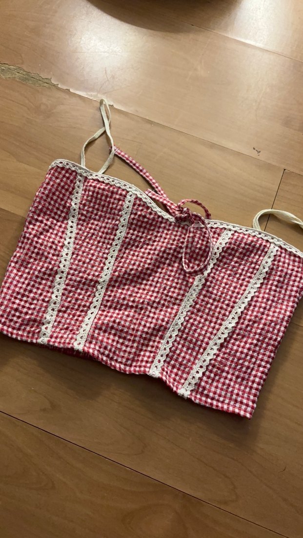 Kırmızı kareli dokuma, dantel ve işlemeli desenlerle detaylandırılmış, straplez yakalı ve ince askılı, bohem tarzda dar kesim bir büstiyer. XS beden Defosuz Koton