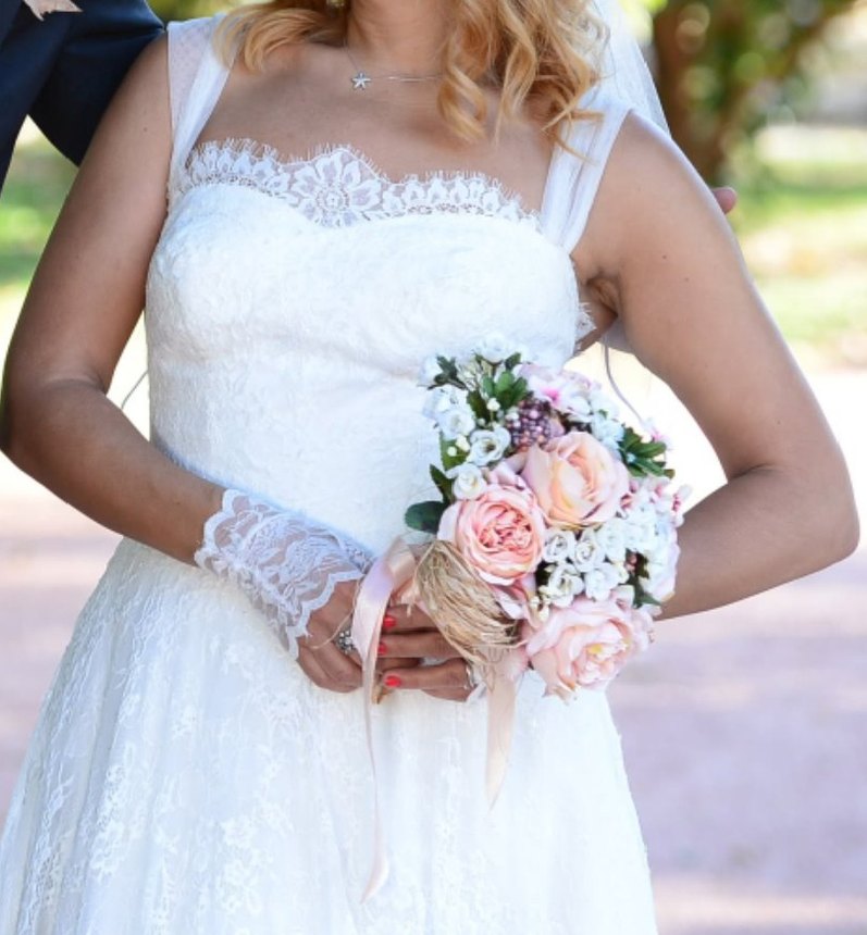 Klasik şıklık için dantel detaylı straplez yaka ve kısa kesim vintage tarzı, belden vücuda oturan, altı kloş gelinlik. Sırttan fermuarlı, içi çift kat dantel ve astarlı, göğus ici kendinden sütyenli. Dizde boy.
