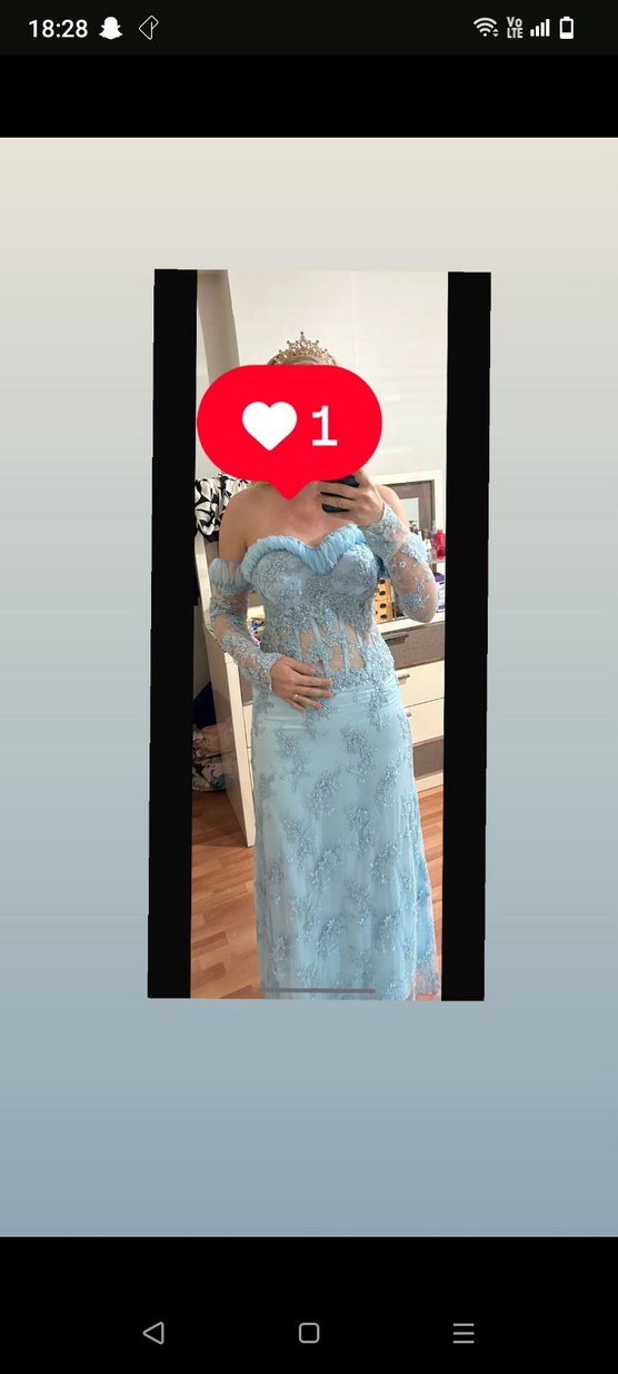 Açık mavi, dantel uzun kollu ve işlemeli detaylara sahip, straplez, vücuda oturan abiye elbise. Bohem tarzıyla dikkat çeker.